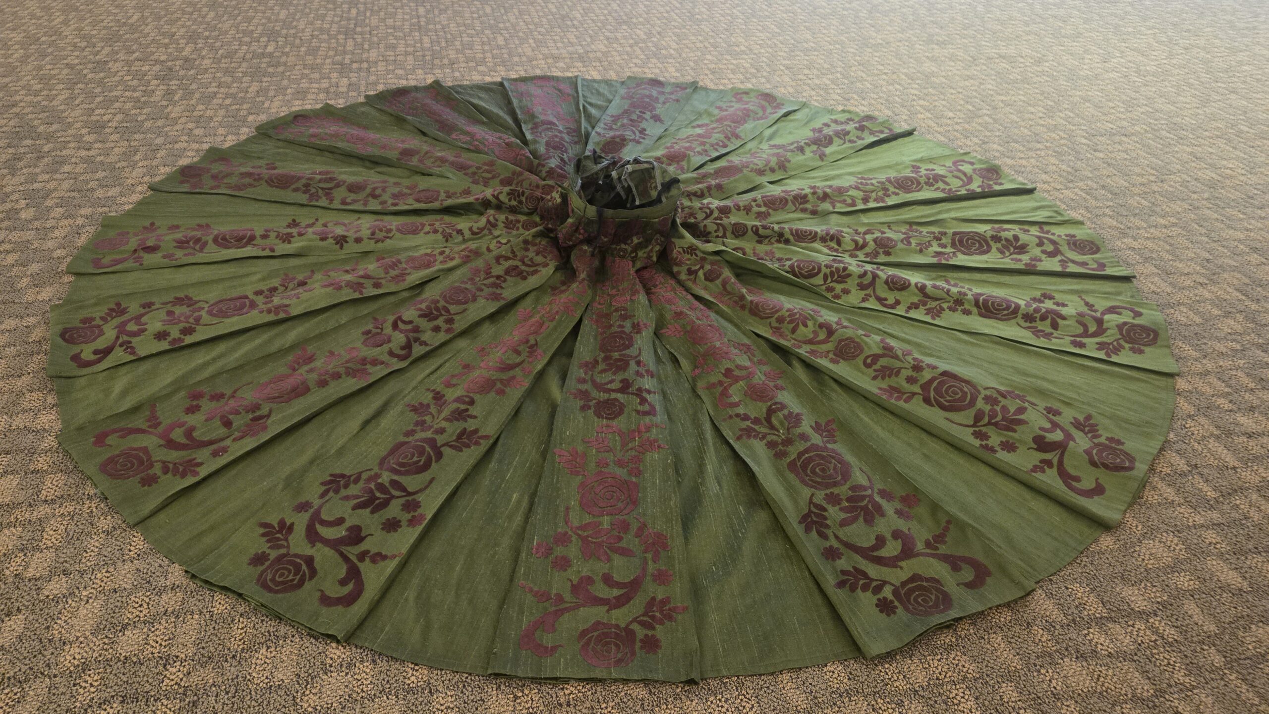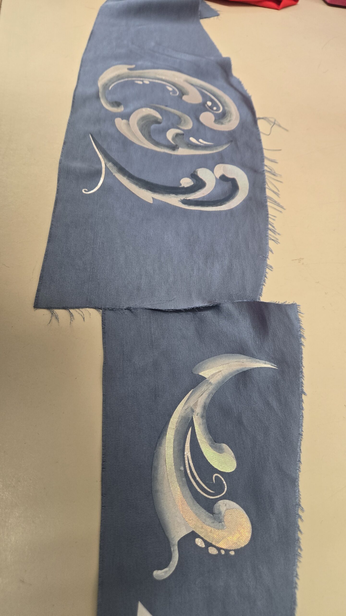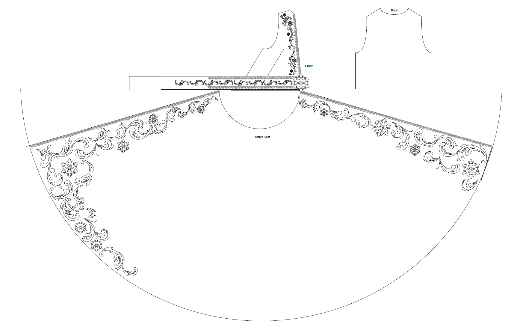 Designer renderings are a great tool to provide a feel for design and detail to the costume shop; however, when working with a Cricut, you need clean edges and specificity in the scale of designs. I was excited to use my skills in CAD (Computer-Assisted Design) in software such as Adobe Illustrator, combined with my draping and flat patterning knowledge, to create digital maps of the potential design options for both Anna and Elsa. This way, we had clear and direct communication with the designer to mock up designs and make real-time changes before any material was used. For Anna, I was given images of trims for inspiration and found transparent PNG images of similar silhouettes online, and combined the motifs to create her skirt panel designs. I applied this to a digitally drafted pattern of the skirt panel with two options for the density of the design, and our designer was able to tweak things until it was perfect. For Elsa, our designer gave the rosemalling inspiration to our craftsperson, who was able to digitally paint a collection of swirls to use as elements for a larger design. Once those elements were simplified into outlines, I created the digitally drafted pattern of the duster to lay out the individual swirls and create the overall design map.
