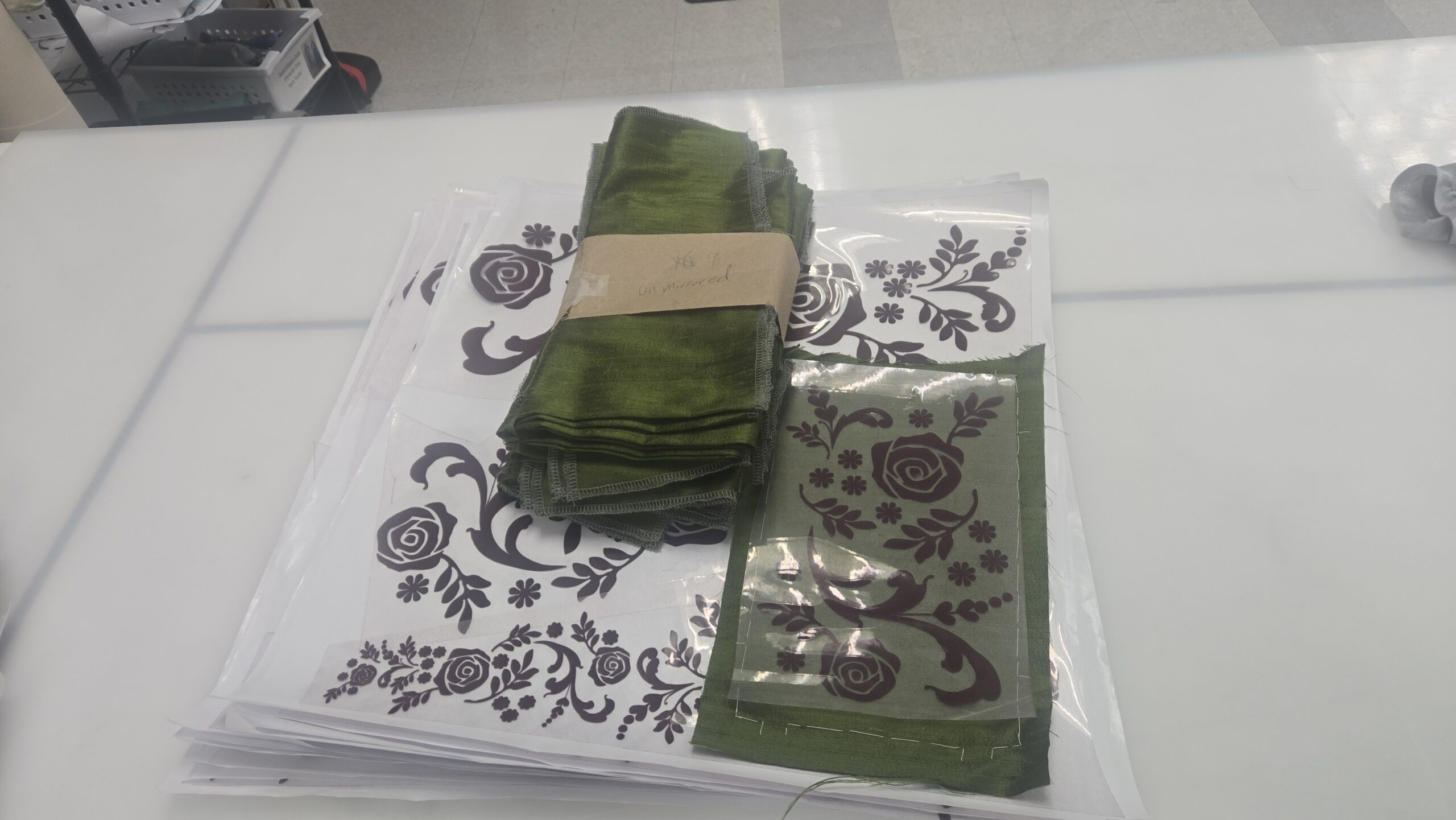 Once the designs were finalized, it was a team effort between Murrow and me to cut and weed, a technique to remove the negative space, of all the HTV according to our design maps. This was done in two ways, with Anna’s design, we cut the long panel into segments that would fit in the size of the Cricut Heat Press. With Elsa, I wanted to make sure the map was clear since Murrow would be cutting and pressing these swirls while I did Anna. Therefore, I labeled the swirl types 1 out of 6, then it was marked if was cut normally or mirrored, then I used the alphabet to label each swirl position on the digital pattern, and lastly because my digital drafting is done to scale I was able to calculate each swirl’s specific dimension for Murrow to type into the Cricut software to cut to size.