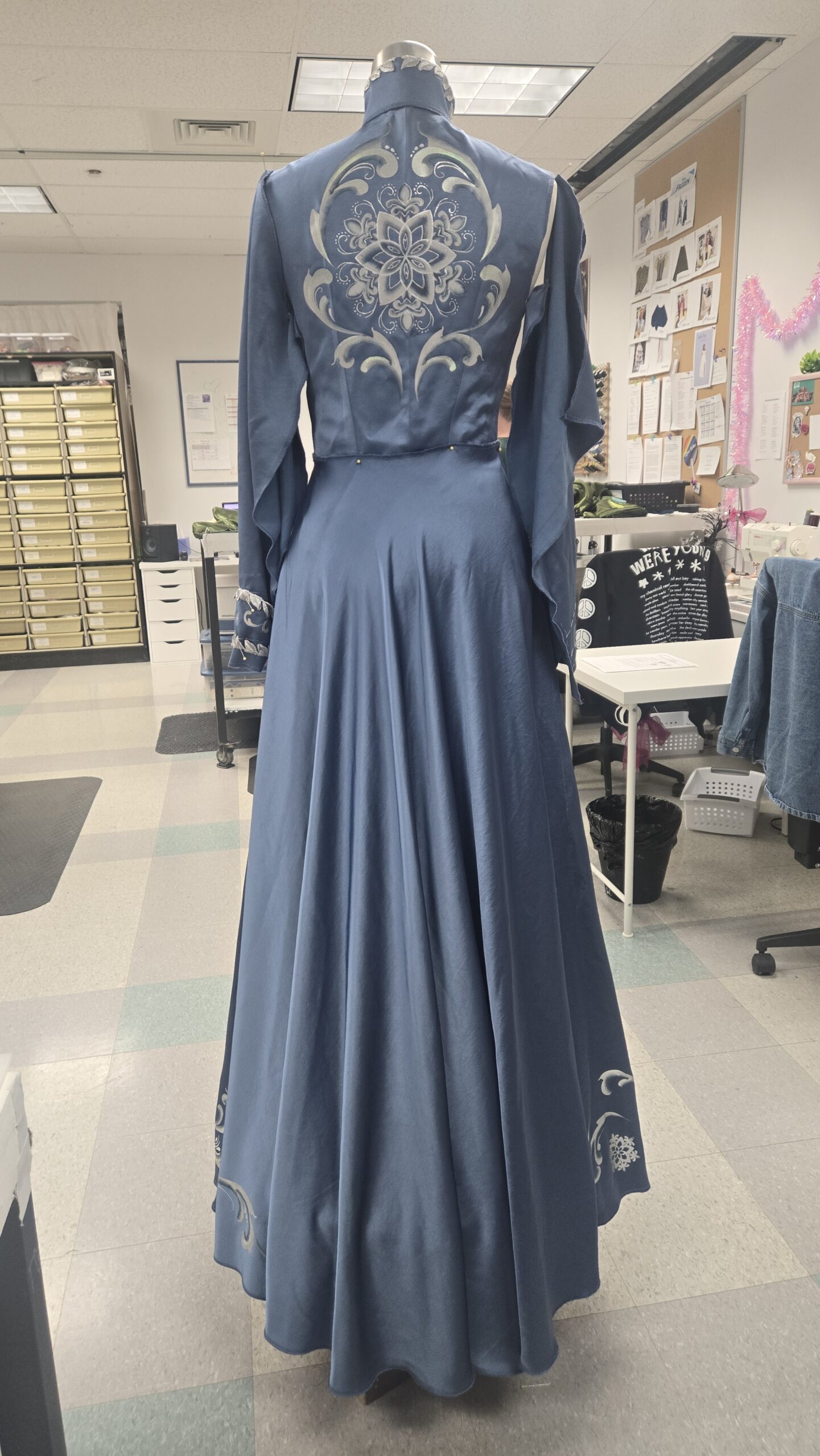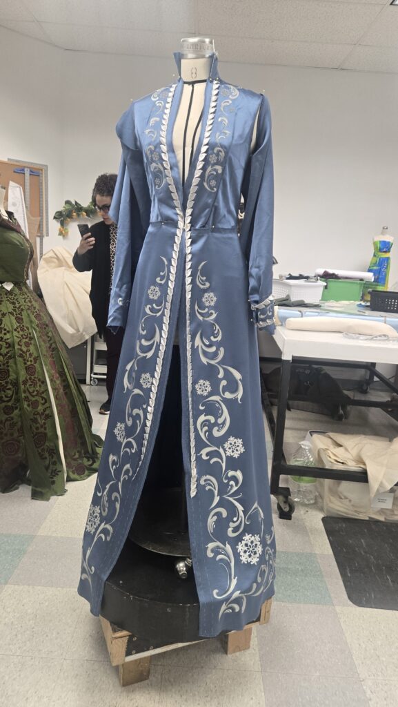 We wanted to achieve a high level of detail in these garments, and with a costume crafts shop of one, Liv Murrow, we started looking into ways to add custom texture and decals to these looks with less time and labor than more traditional methods. We found that different types of heat transfer vinyl (HTV) could be used to great effect. For Anna’s coronation gown and hiking outfit, we used flocked vinyl. This material imitates a velvet’s depth and sheen, while being able to be cut with our Cricut into highly detailed designs. For Elsa’s corset, we used holographic faux-rhinestone material and cut small circles and diamond shapes to apply a large volume of sparkle in a short amount of time. For the duster, we used aurora vinyl for the snowflakes and small details. We also used reflective vinyl, typically used in safety gear, as a base for a rosemaling painting technique to be applied. Murrow was able to take the cut vinyl, transfer it to transfer tape, paint the gradient designs, and then transfer them back onto the garment. This provided a great amount of control in the painting onto fabric, no need to worry about a stray paint stroke or mistake, the crisp swirling lines were well defined by the vinyl.