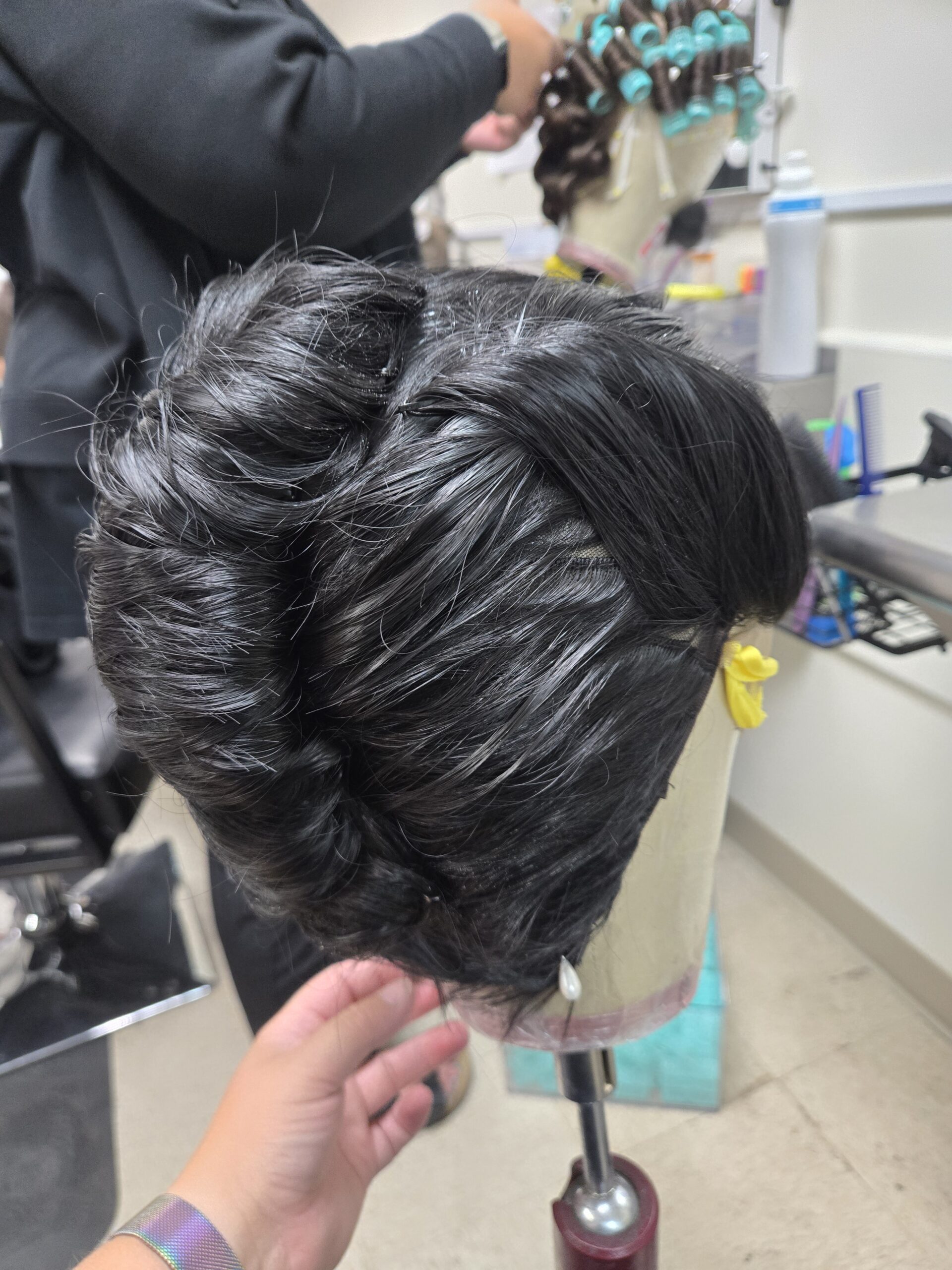 To style the beehive on synthetic hair, I did not tease the hair as you would with human hair, as that can create mats that are difficult to remove. Instead, we use “rats,” which are bundles of synthetic hair tied into a hair net that can provide volume without damage.