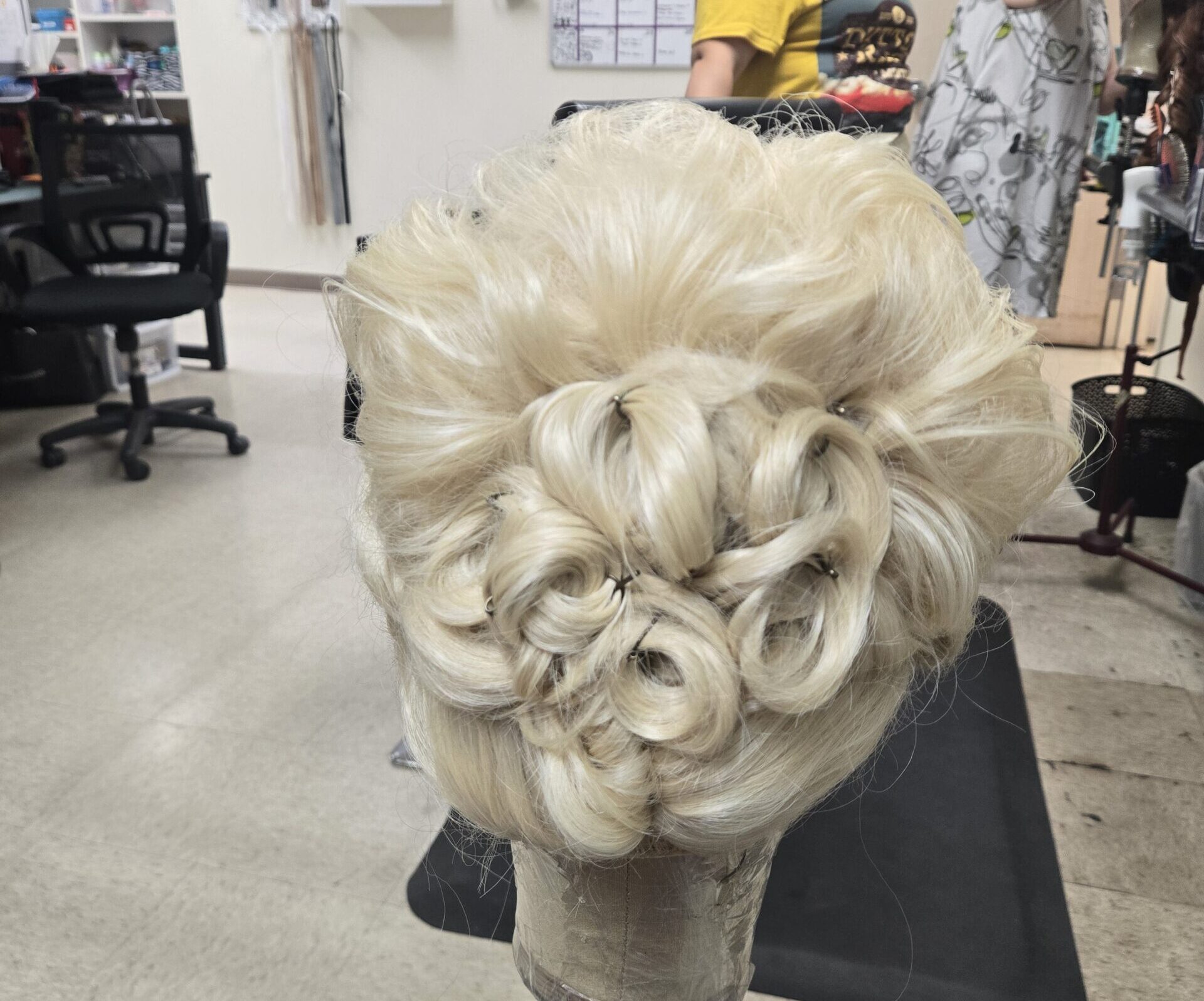 For the French twist chignon, it really is just a matter of practice. Getting a feel for gathering so much hair and rolling it can be tricky, especially on synthetic hair. However, with a little product for grip, time, and patience, the hair can be rolled against the head and pinned into place.