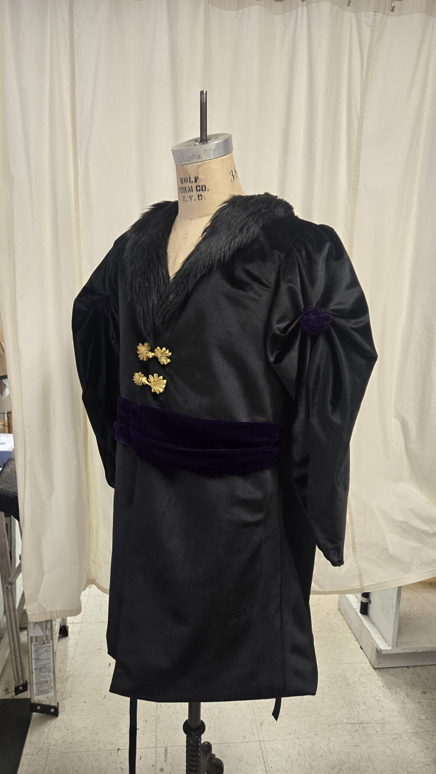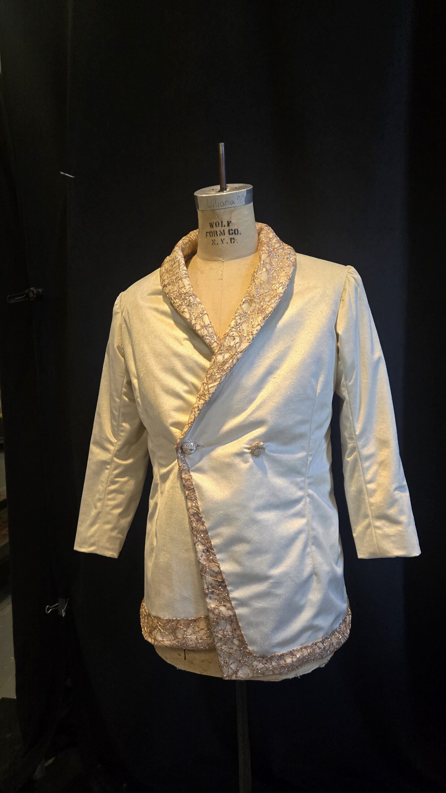 Working with velvet in theatrical tailoring was a new challenge for me and my team at CSF this summer. Drafting these suits was a fairly standard process using the Sartor System of theatrical drafting. When cutting I instructed the first hand to pin the fabric nearly every inch on the selvedge and cut edges, to help mitigate the widgy movement of the fabric. We flat lined the white velvet with cotton to help provide structure, though if I did this again I would use a heavier weight material for the flat lining. Because we wanted movement in the black velvet suit it was not flatlined. During the stitching of these garments I taught my first hand and stitchers the rule of “a baste is never a waste”, and so every piece was hand-basted together before being sent through the machine.