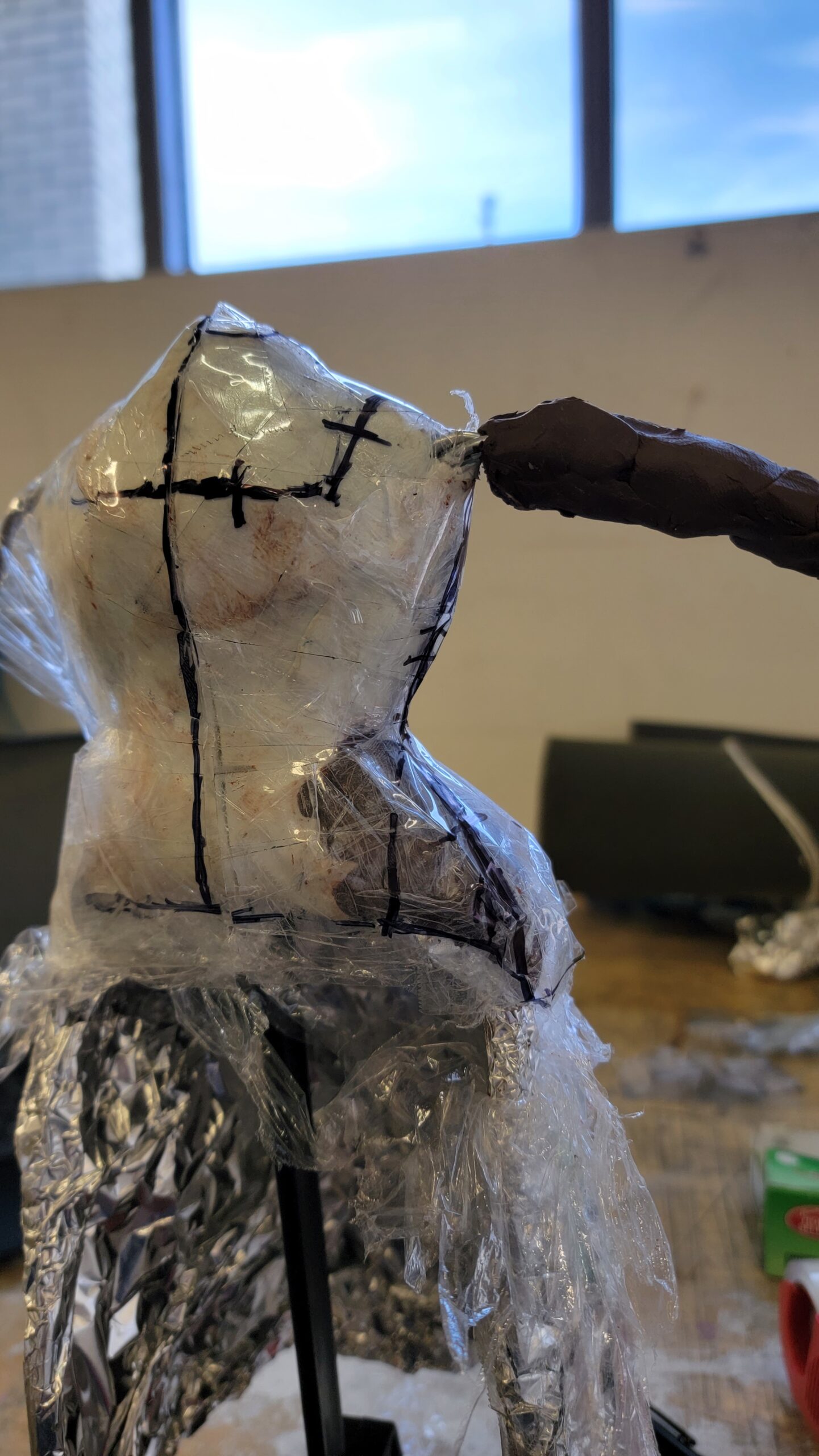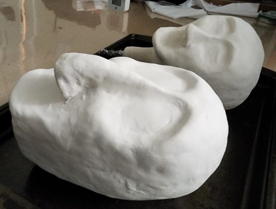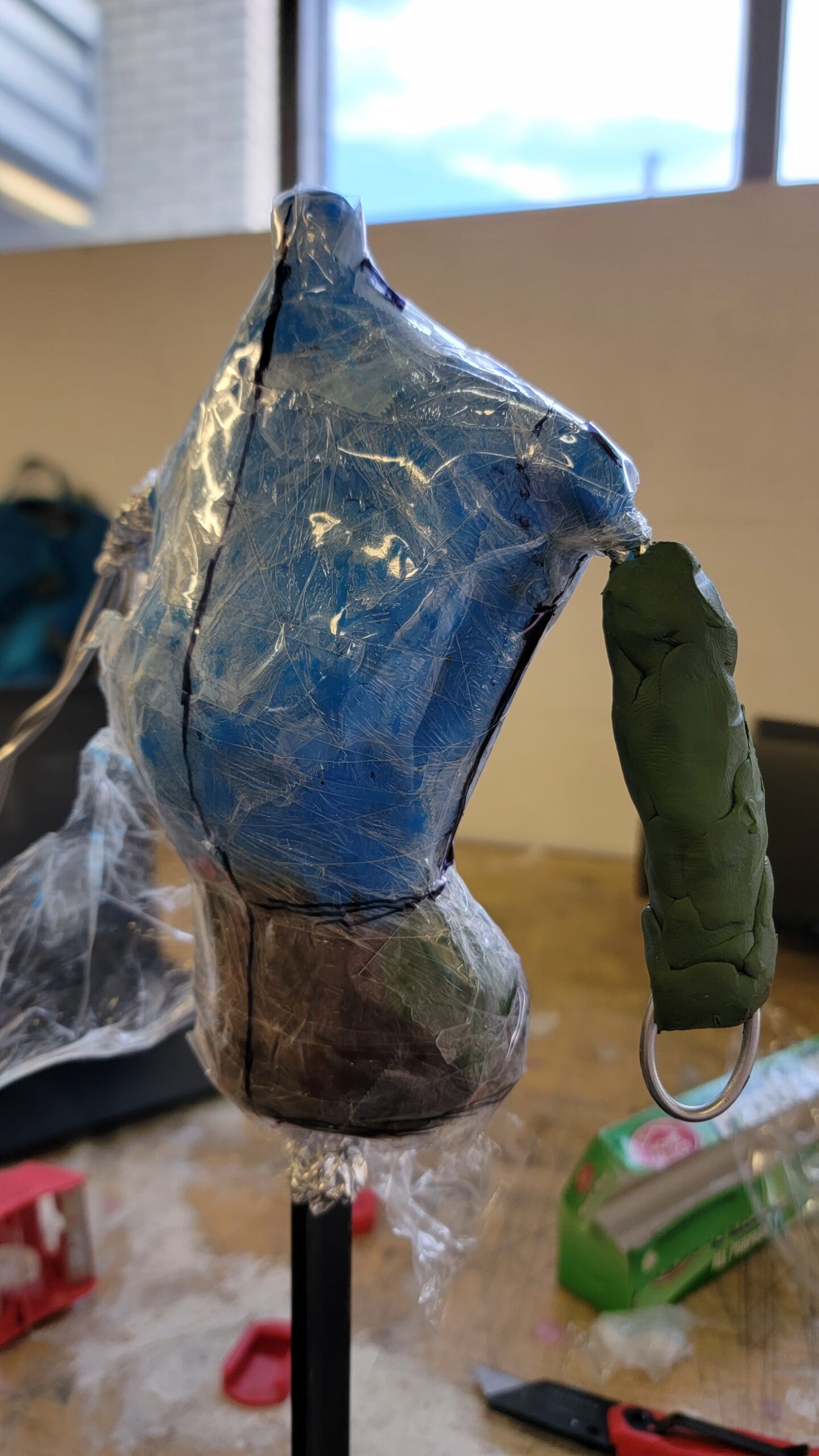 Next is sculpting the hands and faces. Wire frames covered in paper mache is used as a base, then Creative Paperclay is used to sculpt the shapes. Paperclay sculpts like a clay, and dries as light and sturdy as paper mache.