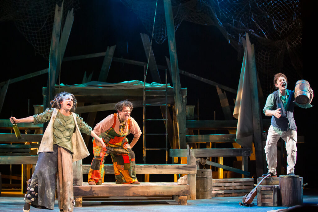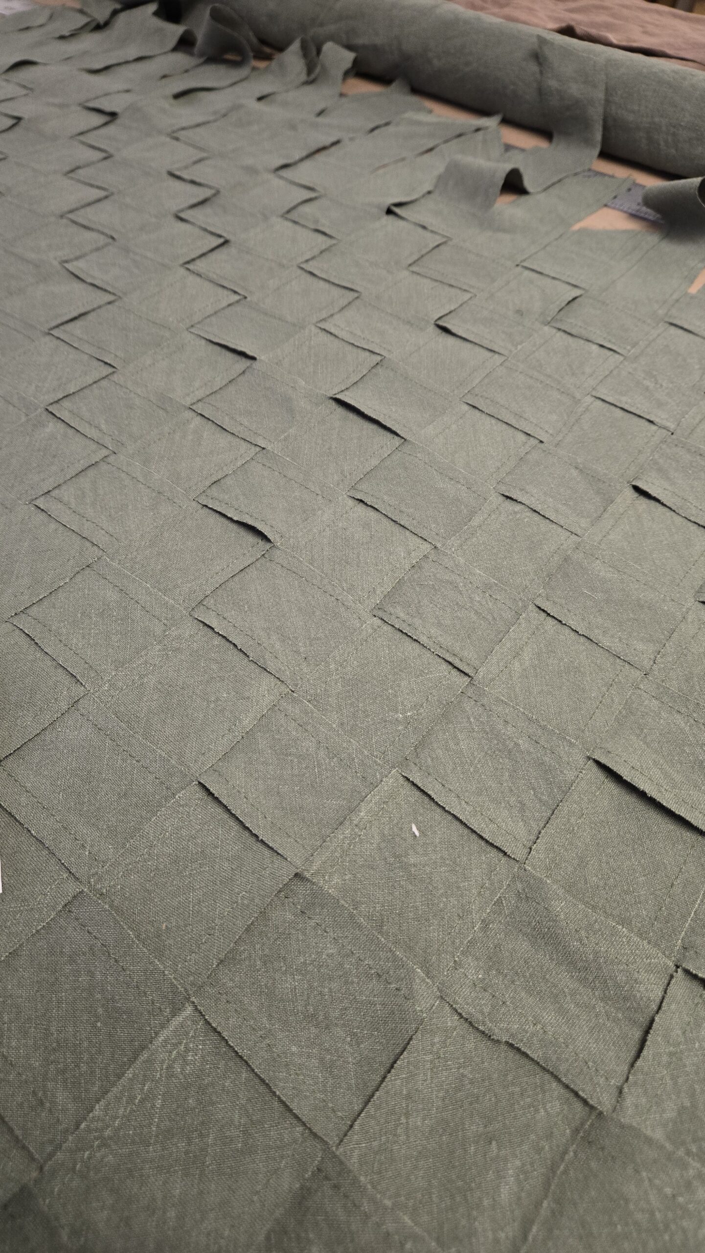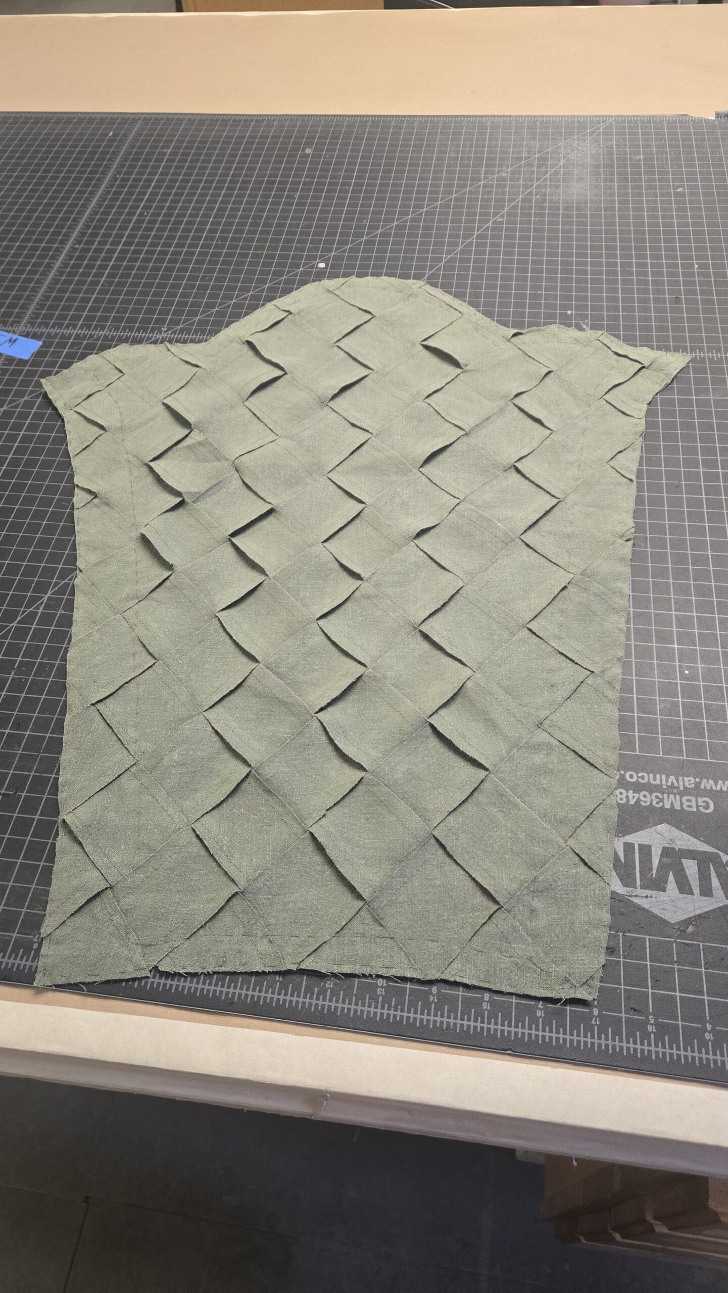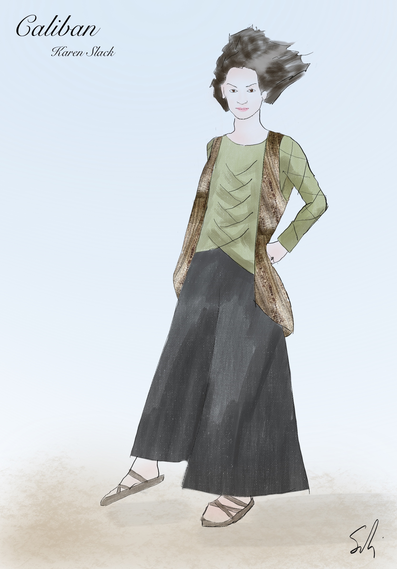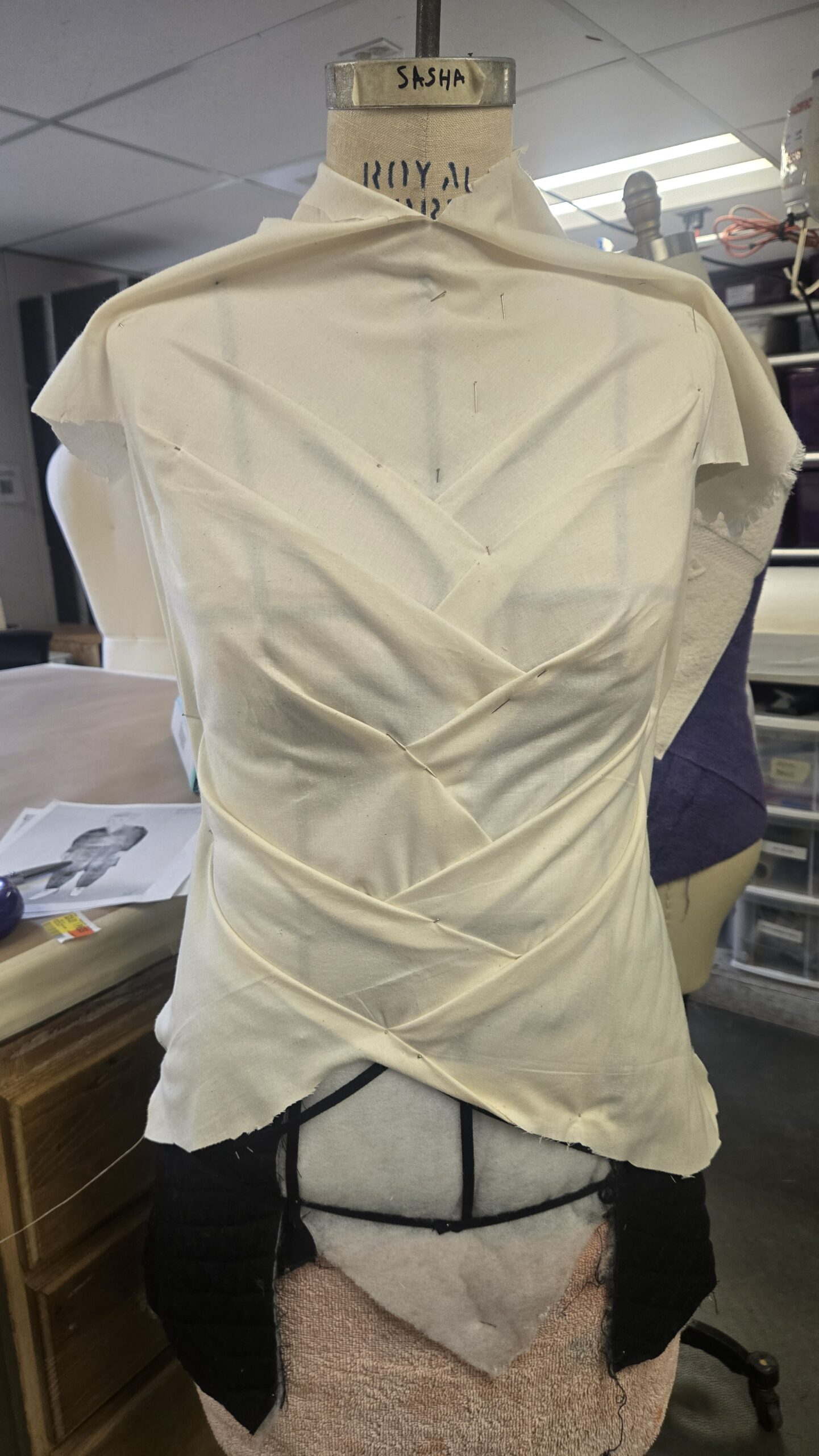 The Tempest was the first production of the 2025 summer CSF season where I worked as the Draper. Caliban’s pleated and hand-woven design was a delight to drape. The origami pleating technique used to create the texture of the center front was a fun challenge, we used strips of raw bias fabric for the sleeves to create a loose open bias feel.