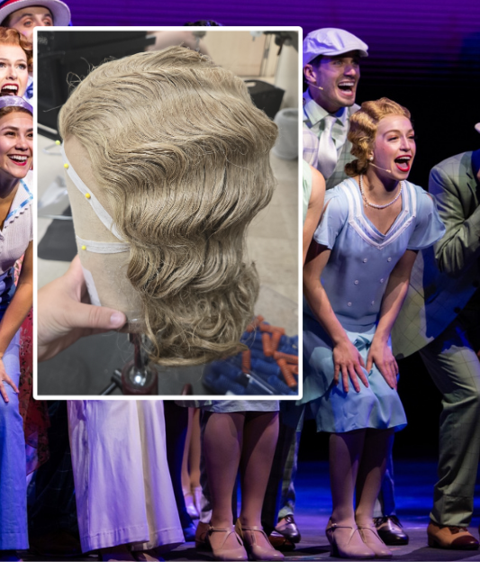 Anastasia features a scene where they go to the ballet, and the ensemble has a variety of fashionable styles, including finger-waves. After washing the wig, I re-blocked it on the actress’s particular wig block; this way, the style will fit their head over wig prep and the microphone pack. I applied hair gel through the length of the hair, then starting from the part, I pinned bias tape in place to hold the waves alternating forwards and back along the head. Once the style is pinned in place, the wig is sprayed with heavy-duty hair spray called Got to be Glued, and then dried in the specialty hair-drying cabinet.